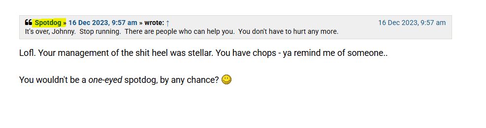 What does that have to do with someone stealing my user name and posing as me and others?*Roshambo » 15 Sep 2025, 4:57 am » wrote: ↑ You changed your name from spotdog. Open it Johnny, click it. It's you Johnny![]()